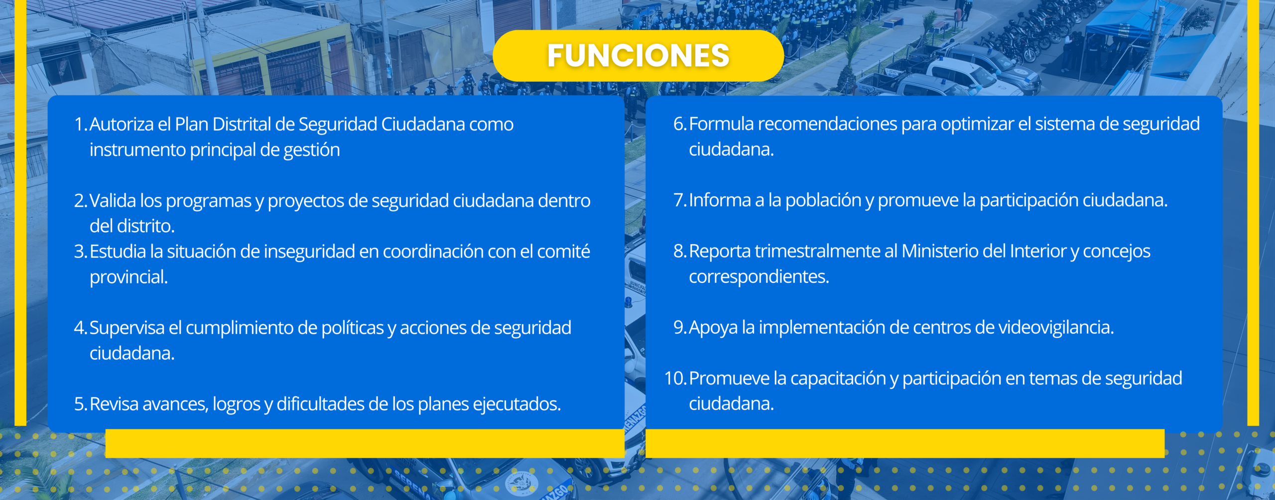 Articular la gestión integral de la seguridad ciudadana, para la generación y promoción de políticas, programas y acciones que contribuyan a la construcción de una sociedad segura para el desarrollo del distrito.